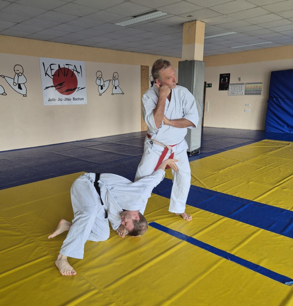 Am Samstag, den 21.03.2026 fand in Bochum der Lehrgang zum Thema Aiki-Jitsu mit dem Referenten Erik Kreiskott 7. Dan Jiu Jitsu und 1. Vorsitzenden des Landesverbandes statt. Ein kleine Gruppe von insgesamt neun Teilnehmern aus vier Vereinen hat in drei Stunden intensiv verschiedene Bewegungsabläufe unter dem Motto „Wie kann ich Angriffe mit möglichst wenig Kraftaufwand umleiten und abwehren“ trainiert und davon profitiert, dass der Referent und sein Uke genügend Zeit hatten bei jedem einzelnen Pärchen Korrekturen und Hilfen vorzunehmen. Wie gewohnt wurde viel gehebelt und Wert darauf gelegt, dass die Techniken auch ohne großen Kraftaufwand funktionieren. Dabei war es dem Referenten besonders wichtig wann die Technik aufgenommen wurde und in welche Richtung sie umgeleitet werden muss, damit eine möglichst flächendeckende Kontrolle während der Ausführung der Technik vorhanden ist.